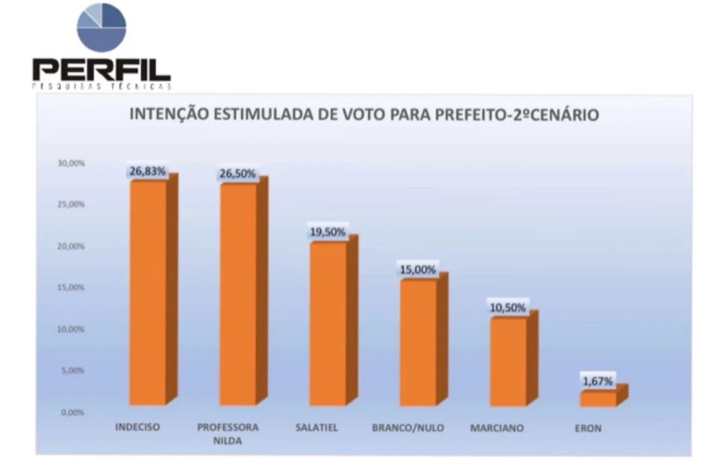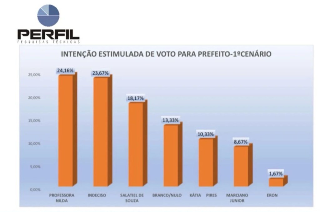 Na cenário 1 de intenção estimulada de voto para prefeito, Nilda aparece com 24,16%, seguida por Salatiel de Souza (PL), com 18,17%. Considerando a margem de erro de 3,98, os dois estão tecnicamente empatados.