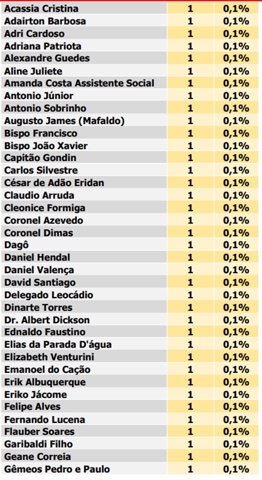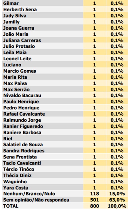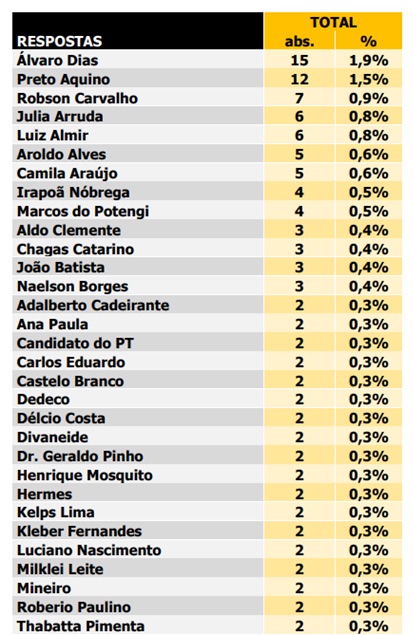 Os nomes mais citados pelos entrevistados foram: Álvaro Dias (1,9%), Preto Aquino (1,5%), Robson Carvalho (0,9%) Júlia Arruda (0,8%) Luiz Almir (0,8%), Aroldo Alves (0,6%), Camila Araújo (0,6%), Irapoã Nóbrega (0,5%) e Marcos do Potengi (0,5%).