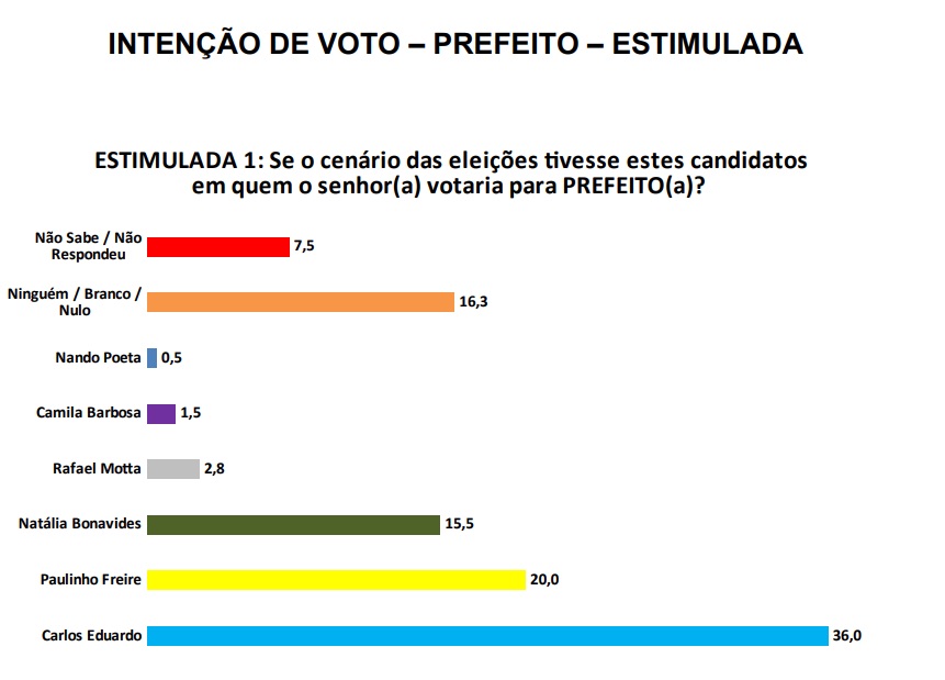 A PESQUISA SETA/ BG/ NATAL avaliou o cenário estimulado para a Prefeitura de Natal. Carlos Eduardo somou 36% das intenções de voto, Paulinho Freire se manteve em segundo lugar com 20%, Natalia Bonavides ficou com 15,5%, seguida por Rafael Motta com 2,8%, Camila Barbosa 1,5% e Nando Poeta 0,5%. Ainda 16,3% votariam branco ou nulo e 7,5% não sabem.