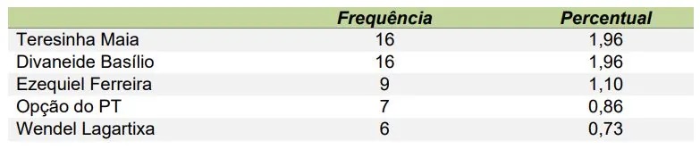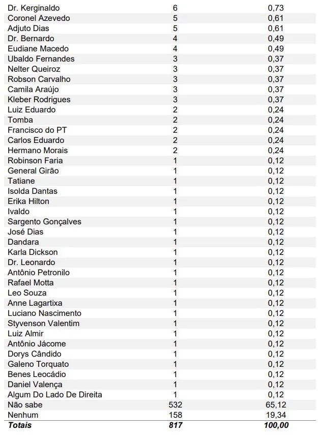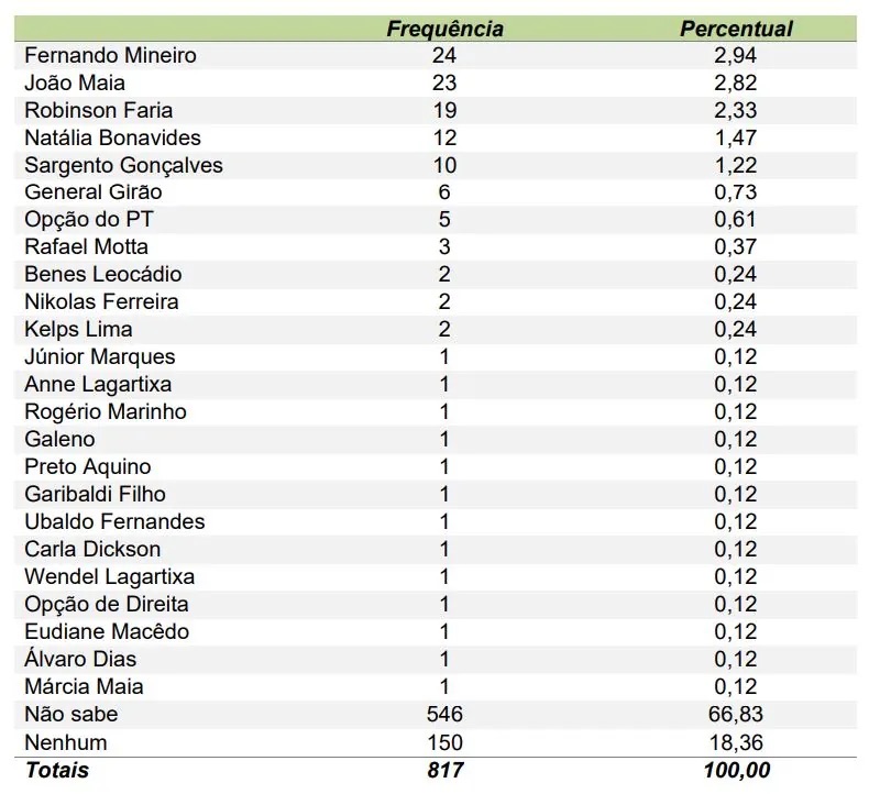 A pesquisa Exatus perguntou em quem os eleitores pretendem votar para deputado estadual e deputado federal. No levantamento para federal, quem lidera a corrida é o atual deputado Fernando Mineiro (PT), com 2,94% das citações. Ele é seguido de perto por João Maia (PP), que tem 2,82%. Ainda aparecem com destaque: Robinson Faria (PL), Natália Bonavides (PT) e Sargento Gonçalves (PL).