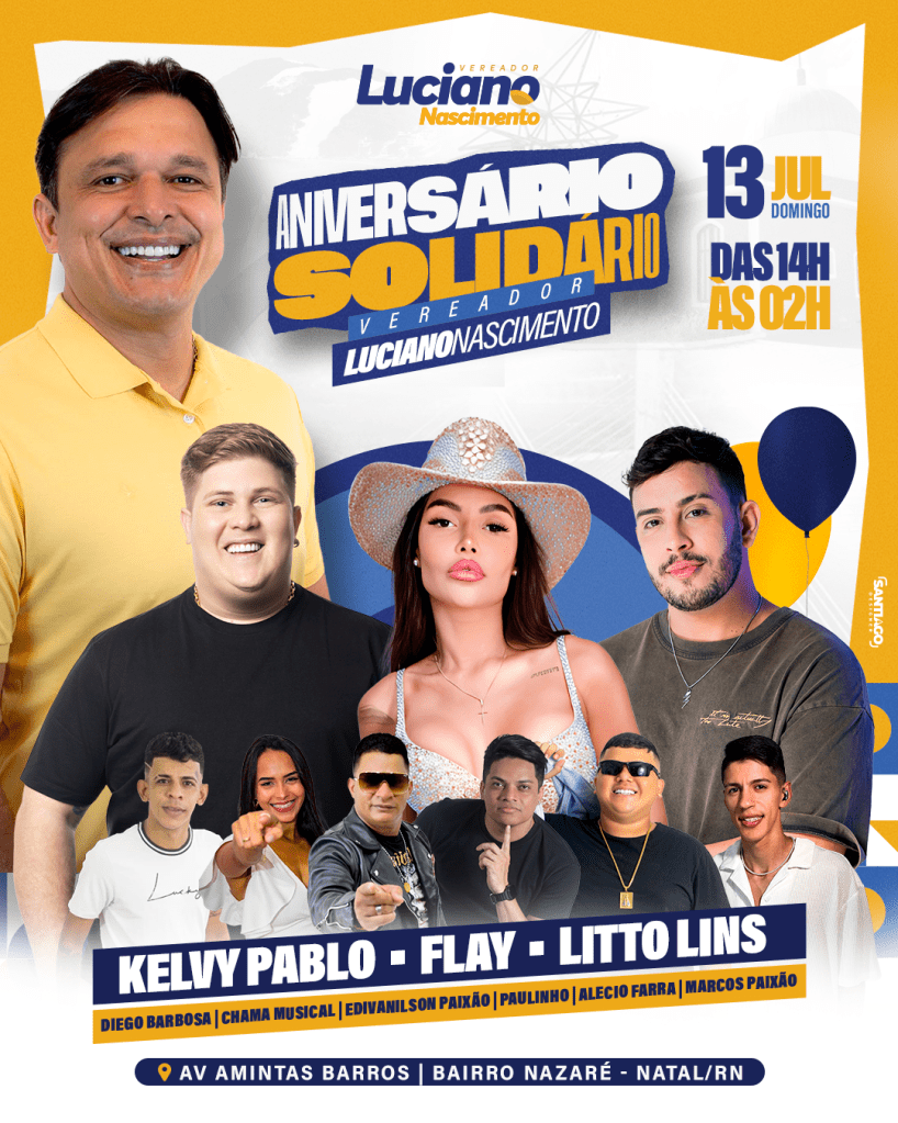 À noite, o evento segue com uma programação cultural de peso, reunindo artistas locais e regionais como Kelvin Pablo, Flay, Litto Lins, Diego Barbosa, Chama Musical, Edivanilson Paixão, Paulinho, Alécio Farra e Marcos Paixão, garantindo entretenimento e celebração para toda a população presente. O Aniversário Solidário acontecerá na Avenida Amintas Barros, no bairro Nazaré, reafirmando o compromisso do vereador com a zona Oeste de Natal.