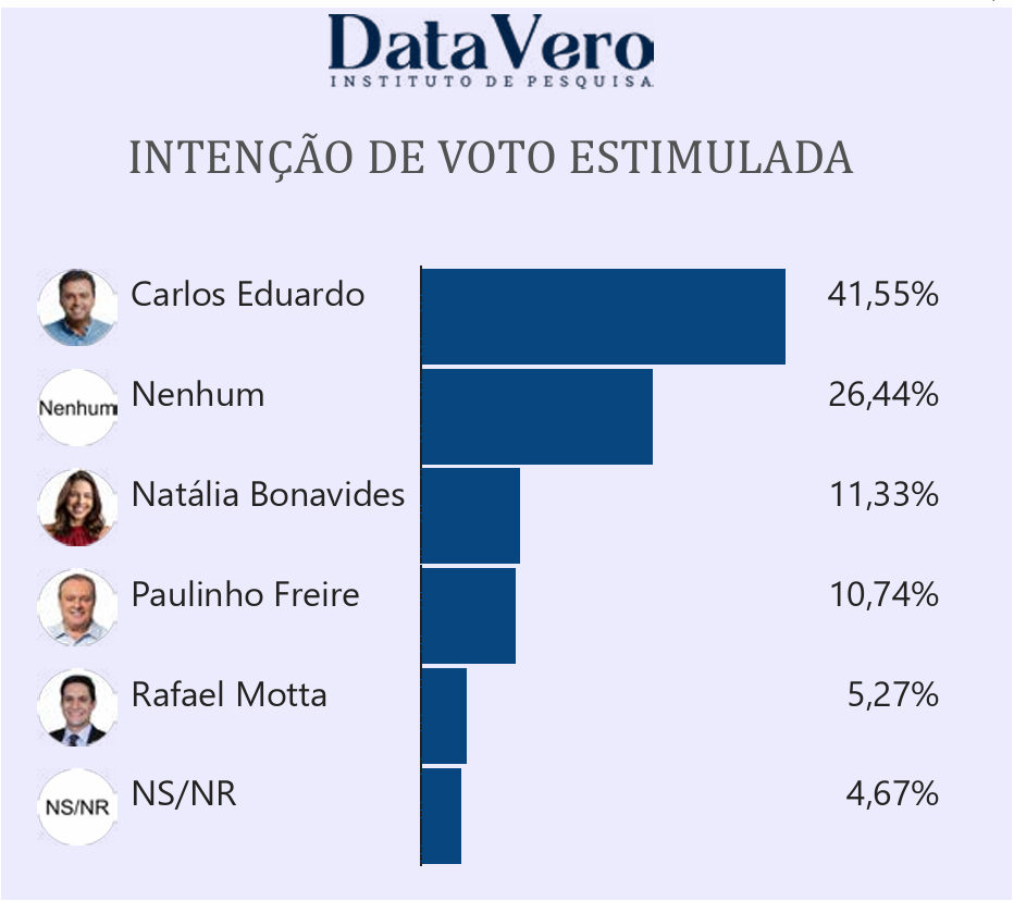 Caso as eleições municipais fossem hoje, o ex-prefeito Carlos Eduardo Alves (PSD) venceria a disputa pelo comando da Prefeitura de Natal, conforme pesquisa de intenção de votos realizada pelo Instituto Datavero e divulgada pelo Diário do RN nesta terça-feira (26). O ex-gestor foi citado por 41,55% dos natalenses consultados no cenário estimulado – quando os nomes dos pré-candidatos são apresentados aos entrevistados.