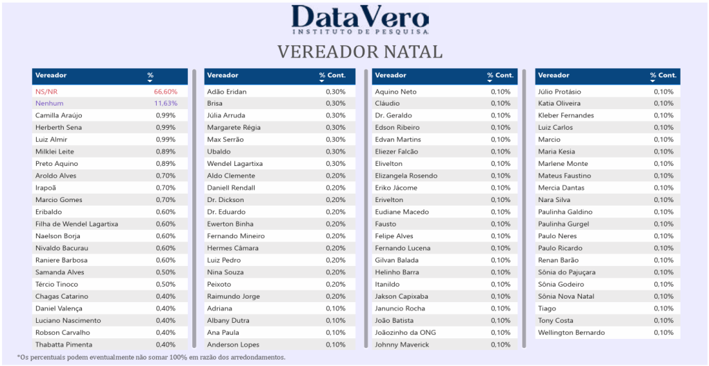 Já os que receberam 0,60% das citações na pesquisa Datavero para vereador de Natal são: Eribaldo Medeiros, Filha de Wendel Lagartixa, Naelson Borja, Nivaldo Bacurau e Raniere Barbosa. Entre os que foram citados por 0,5%, estão: Samanda Alves e Tércio Tinoco.