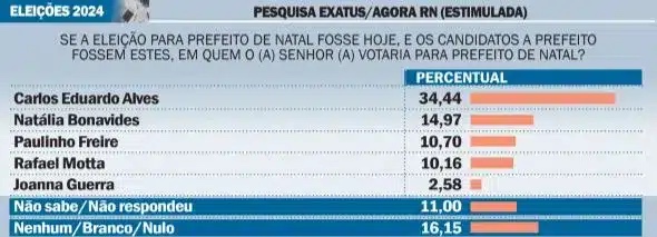 Já na pesquisa estimulada, Jaime Calado aparece com 40,6% e Eraldo Paiva tem 36,4% enquanto Geraldo Veríssimo surge com 7,6%. Já os indecisos, brancos e nulos somam 15,4%.