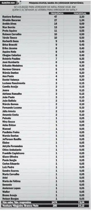 O prefeito de São Gonçalo do Amarante, Eraldo Paiva (PT), lidera a pesquisa espontânea realizada pelo Item Pesquisas e Tribuna do Norte. Neste levantamento, Eraldo Paiva tem 24%, o ex-prefeito e atual secretário estadual de Desenvolvimento Econômico, Jaime Calado (PSD) aparece com 23,2%, Geraldo Veríssimo 4,8%, Teresinha Maia ou candidato dela 3,2%, candidato de direita 1,4%, qualquer nome da oposição 1,2%, Poti Neto 1%, Rayure Protássio 1%, outros nomes citados 1,2%, e indecisos ou não quiseram opinar 39%.