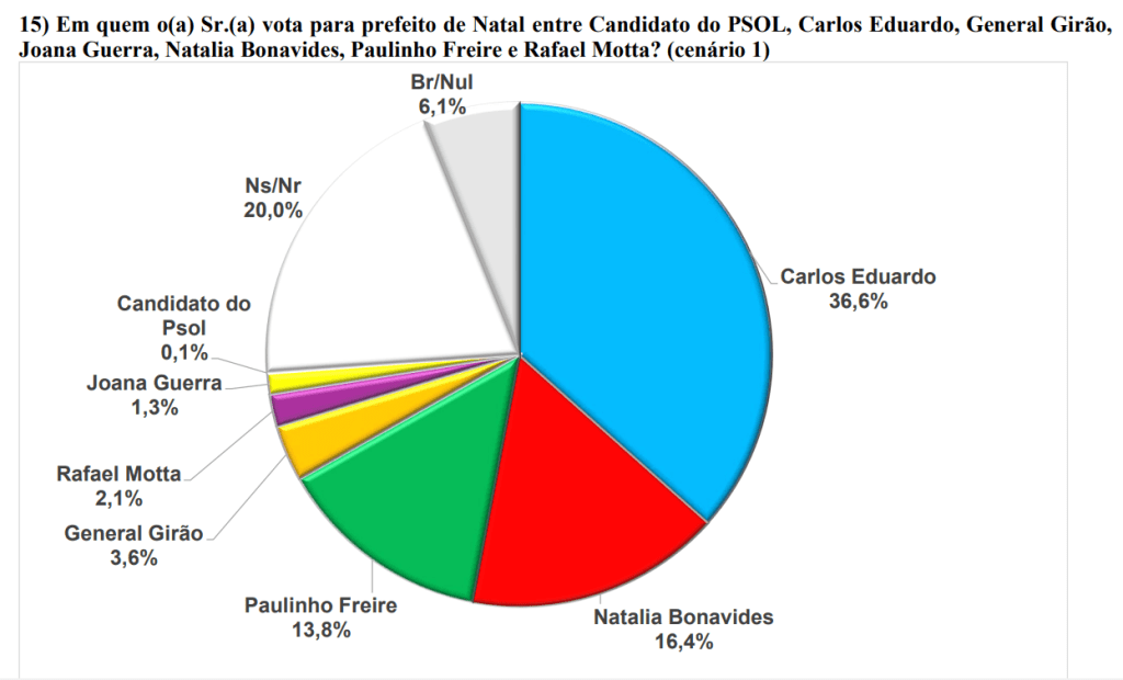 No cenário estimulado, em que os nomes de pré-candidatos são apresentados, o resultado apontou: Carlos Eduardo lidera com 36,6%, seguido de Natália Bonavides com 16,4%, Paulinho Freire 13,8%, Girão 3,6%, Rafael Motta 2,1%, Joana Guerra 1,3%, candidato do PSOL 0,1%. 20% não responderam e 6,1% votariam branco ou nulo.