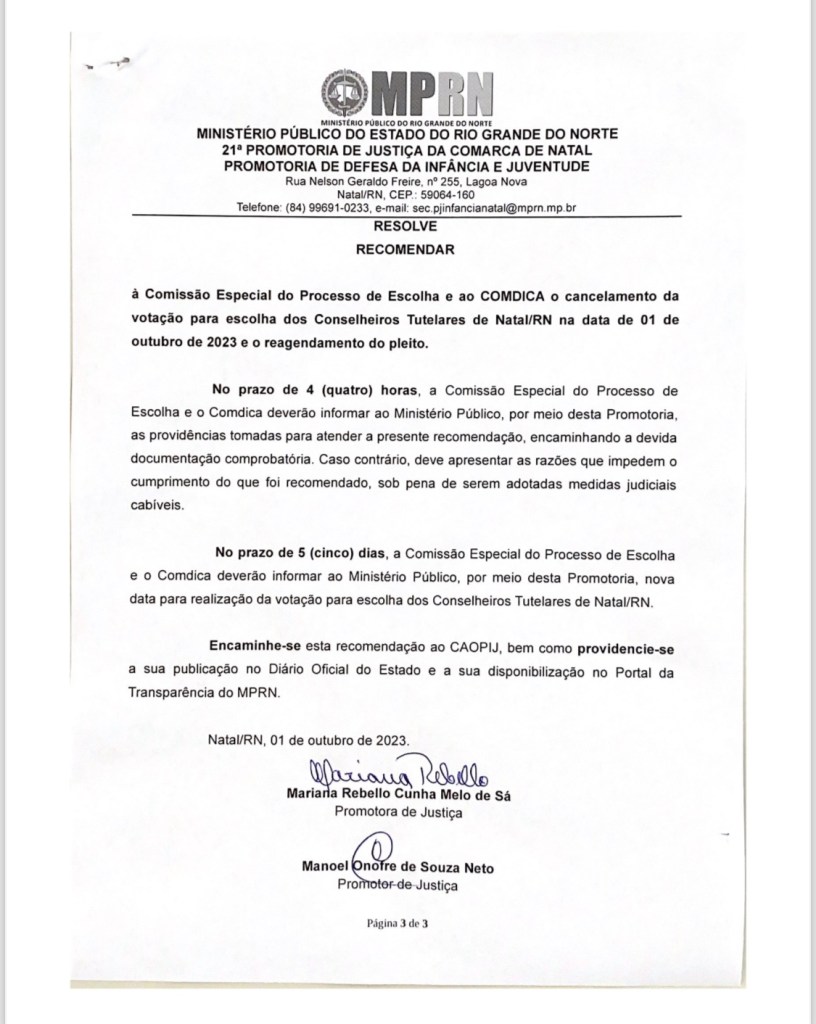 O Ministério Público emitiu uma recomendação na manhã deste domingo(01), onde encaminha ao COMDICA, a recomendação para o adiamento das eleições para o Conselho Tutelar em Natal.